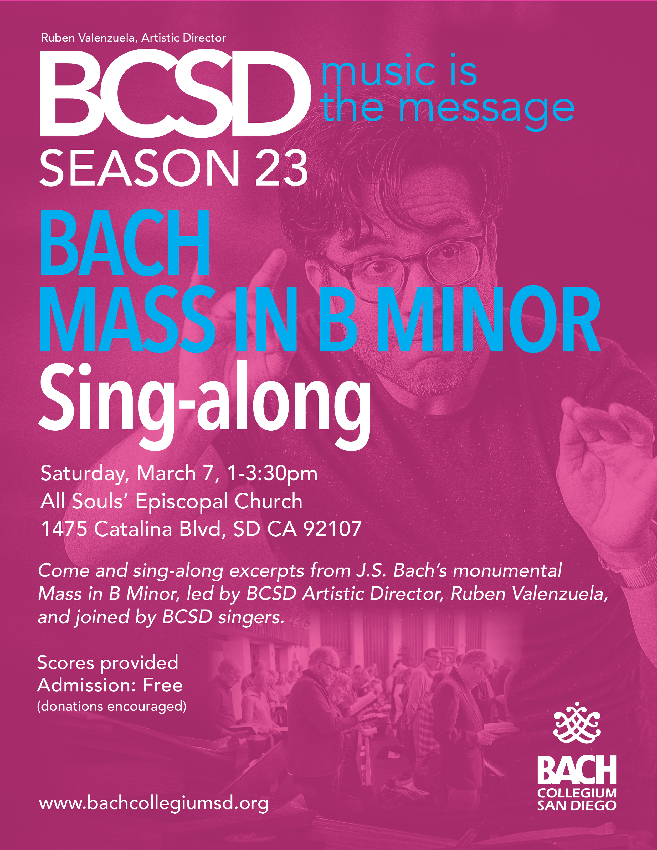 In anticipation of our season highlight concert, come sing-along excerpts from J.S. Bach’s monumental Mass in B Minor, led by BCSD Artistic Director Ruben Valenzuela, and joined by BCSD singers.